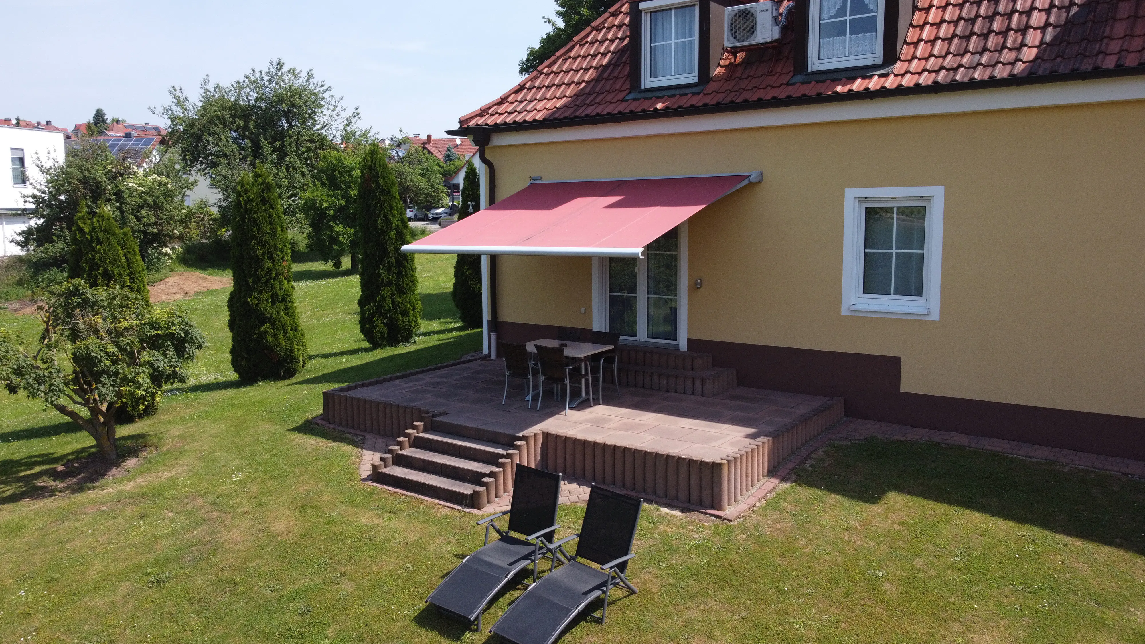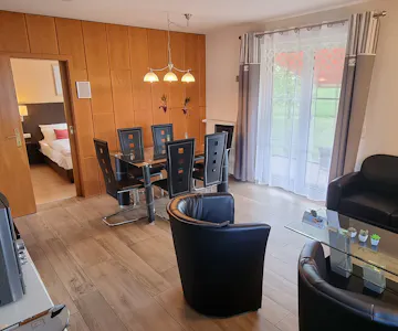 Ideal for families, our holiday apartment accommodates up to 4 people in 2 separate bedrooms with a shared bathroom, a separate toilet, a living room with a dining area, and a new fully equipped country-style kitchen with Siemens appliances.